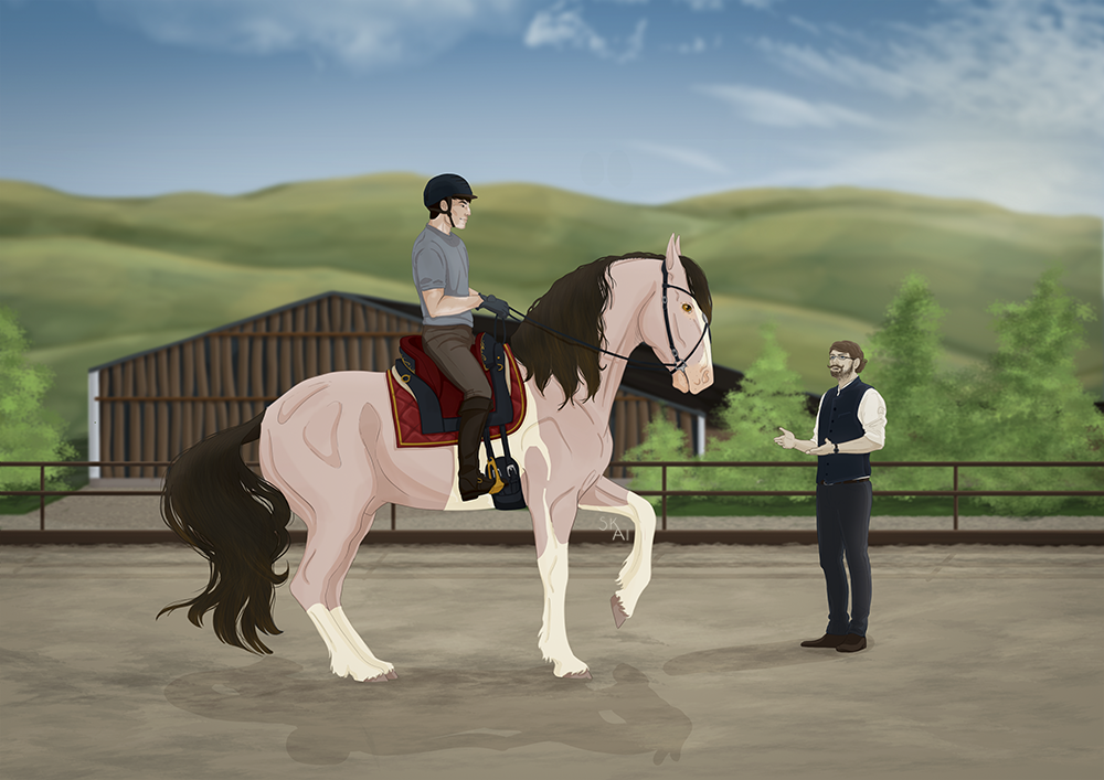 Skai - Galahad of Dzelzain PKK3758 (kuva) EM: Tarinallisuus "Valmentajan/ratsastuksenohjaajan piirtäminen mukaan tuo heti tietynlaista tarinallisuutta työhön. Hieno piirros!"