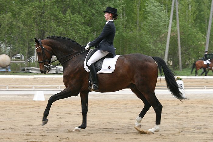 Isä Provinssi Yave kuuluu mielestäni hienoimpiin FWB -hevosiin kautta aikain. Provinssi Yave pärjäsi hienosti kouluratsastuksessa myöhemmin saavuttaen laatuarvostelupalkinnon KRJ-II'n. Sen lisäksi ori palkittiin YLA3 -palkinnolla sen hienojen sivujen ansiosta. Ori oli syntynyt 02.11.2005 kasvattajansa luona Yavessa (om. cirith) ja laukannut ajasta ikuisuuteen marraskuisena päivänä vuonna 2007. Isänisä Aias Yave oli VIR MVA Ch -palkittu, upea ja hieno ori Brietrandigin hevoskannan keskuudessa. Ori oli muotovaliosuutensa lisäksi palkittu KRJ'n laatuarvostelussa peräti ensimmäiselle palkinnolle, sekä ori oli esikantakirjattu. Aias oli hieno suomalainen puoliverinen, ja sen oli kasvattanut cirith jo lopettaneessa Yavessa. Tietojen mukaan ori elämänsä aikana jätti jälkeensä 12 hienoa jälkeläistä. Isänemä Altaira M on kaunis, suomalainen puoliveritamma Yavesta, joka oli luonteeltaan asiallisesti käyttäytyvä tamma, mutta vain kokeneiden ja "isojen ihmisten" käsissä. Tamman hieno kaksipolvinen suku tuo esiin muistoja vanhoista ajoista, muunmuassa kaikki Ninitran hevoset ja tietenkin varmasti kaikkien tuntema Startallin ori Alte. Altaira M on KRJ-II palkittu, pisteillä 85. Emä Keeleigh Juliette on Maria H'n kasvattama nätti koulutaituri, joka edustaa rotua FWB. Keeleigh Juliette on kilpaillut kouluratsastuksessa hyvin sijoituksin, ja tamman KRJ'n laatuarvostelusta tullessaan on mukana tullut palkinto KRJ-II, pistein 93. Tamma on luonteikas, joskin hyvinkin haastava tamma. Luonnetta se on perinyt vanhemmiltaan, varsinkin itsetietoisuuden, mutta myöskin hienot koululiikkeet. Tamman omistaa nykyään Werty, ennen se asusti Heidi C'n luona Adorossa. Jo edesmennyt emänisä Adoro's Arnaldo, Champion palkittu FWB-ori, oli tunnetun Te Adoro Estaten ensimmäinen kasvatti, joka oli syntynyt vuoden 2004 puolella. Ori on lisäksi palkittu KRJ-I palkinnolla pistein 108 ja Arnaldo on esikantakirjattu hyväksytysti. Arnaldo elämänsä aikana jätti 18 jälkeläistä, eli muita pikku-Arnaldoja. Emänemä NRW Sonja on mukava ja ystävällinen FWB-tamma, jolta ei taitoa kouluratsastuksesta puutu. Laatuarvostelusta KRJ-I palkinnolle palkittu tamma on pärjännyt vallan mainiosti koululuokista tasoilta HeC-VaB, ja korkeimmiltakin. Koska tammassa on täysiveriverta, kertookohan sisukkuus hyville palkinnoille siitä? ![]() Jälkeläiset FWB-t Shadow's Dauntless (KRJ II), s. 25.1.09 (e. Shadow's Linia Falista) FWB-o Ugly and Rich HMA (YLA2, SPL-I), s. 25.1.09 (e. KRB Blueberry Fudge) FWB-t Cyberspace Vegas, s. 10.09.2010 (e. Acneface 54) FWB-t Shadow's Veramente, s. 03.04.2011 (e. Shadow's Vivencia) FWB-t Fate of Bastion, s. 04.07.2015 (i. Adoro's Jaylove) FWB-t Saeva Lovedior, s. (e. Kungsby Ladydior) ![]() ![]() ![]() Päiväkirja ja valmennukset 02.09.2015: Päiväkirjamerkintä Niin se vain on. Jaikka täytti tänään 25 vuotta. Hurjan nopeasti tuntuu aika menevän, ja näkeehän sen orin luonteestakin että vanhuus on iskemässä. Edelleen ori kyllä reippaasti touhuilee ja jaksaa liikkua ilman ongelmia, eli vielä ei ole paniikkia hevosen terveyden puolesta, mutta kovin rasavilli se ei enää ole. Toisaalta, toistakymmentä vuotta orin ärsyttäviä ja turhauttavia toilailuja katselleena ehkä rauhoittuminen ja "herrasmieheksi" muuttuminen olikin hyvä asia. ;) Jokatapauksessa, orin kanssa kilpaillaan vielä sen verran että saamme sille kasaan 40 sijoitusta kouluratsastuksesta. Jaikkaa tuskin tulen laatuarvosteluun viemään (ellei ihme tapahdu), mutta eipä niistä sijoituksista mitään haittaakaan ole. Toivotaan, että Jaikalla on edessään vielä ainakin 5 vuotta kilpauraa! Tänään Jaikka pääsi pitkästä aikaa maastoretkelle mukaan. Mukaan reissuun tuli myös tallityttö Agatha toisen vanhushevosen Nervous NON:n kanssa. Retken metsän siimeksessä tuli aluksi olla rauhallinen köpöttelylenkki, mutta energiaa keränneet orit halusivat mennä kovempaa. Niinpä pidettiin pieni laukkakilpailu hiekkasuoralla ja hevoset saivat juosta niin kovaa kuin pääsivät. Kumpikaan ori ei halunnut hävitä toiselleen vaan innostuivat entisestään, ja lopulta hevoset pysähtyivätkin vasta kun hiekkatie muuttui kapeammaksi metsäpoluksi... Ainakin saivat päästellä höyryjä! Retkeä jatkettiin rauhallisesti ravaten ja käynnissä liikkuen, pysähdyttiin myös evästauolle jonka jälkeen suuntasimme takaisin tallia kohti. Loppulenkki sujui taas rauhalliseen malliin, mitä nyt yhdessä vaiheessa lennähti pusikoista ukkometso hevosten eteen, mutta kumpikaan ori ei lintua sen kummemmin säikähtänyt. Tallille päästiin täysin ehjinä ja tyytyväisinä. ![]() Kilpailutuloksia Vain sijoitukset merkitty (31 kpl)